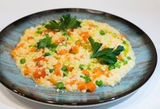 285 г • Птитим, перец, морковь, горошек, масло сливочное, сливки, соль, перец черный молотый, пармезан