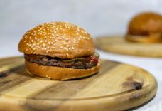 130 г • Булочка, котлета из говядины, огурец маринованный, кетчуп, горчица