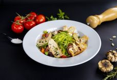 300 г • Куриное филе, томаты черри, салатные листья, сыр Пармезан, сыр Моцарелла, оливки