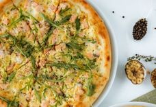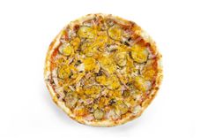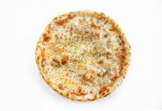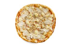 400 г • Грудинка свиная, картофель отварной, сыр «Моцарелла», яйцо, лук репчатый, сливки, масло чесночное, соус чесночный, орегано, соус для пиццы