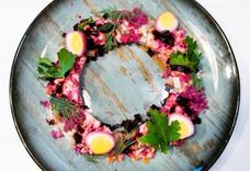 270/4 г • Филе сельди, картофель, морковь, свекла, лук красный репчатый, яйца перепелиные, майонез, укроп, петрушка, желе из свеклы, клюква