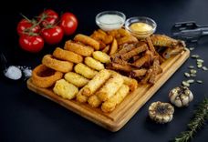 780 г • Луковые кольца, картофельные дольки, наггетсы куриные, гренки с чесноком из черного хлеба, сыр в панировке, куриные крылья, соус Сырный, Чесночный