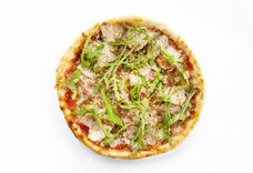 320 г • Курица BBQ, свинина BBQ, бекон, грибы шампиньоны, лук карамелизированный, руккола, сыр Моцарелла, соус Барбекю