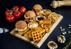 515 г • Мини-бургер cheasy easy , mushroom and cheese, men's health, картофельные вафли, картофельные чипсы, лук фри, соус чепотле, бургер, сырный