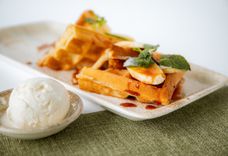 230 г • Вафли с шариком мороженого, бананом, карамелью