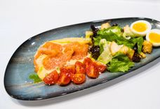 240 г • Лосось, смесь салатов, черри, пармезан, яйца, гренки, соус «Форель»