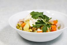 120 г • Ветчина куриная, картофель отварной, морковь отварная, огурец свежий, зеленый горошек, яйцо, майонез, зелень