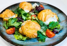 195 г • Профитроли, сельдь, смесь салатов, черри, огурец, сыр сливочный, петрушка, укроп