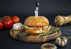 200 г • Бургер с куриным филе-гриль, сыром Креметта, сыром Дор Блю, сыром плавленным, зеленью салата и томатом