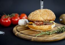 170/120/40 г • Котлета из говядины, булочка, сыр Чеддер, огурцы консервированные, маслины, яйца перепелиные, соус розовый, картофель фри, кетчуп